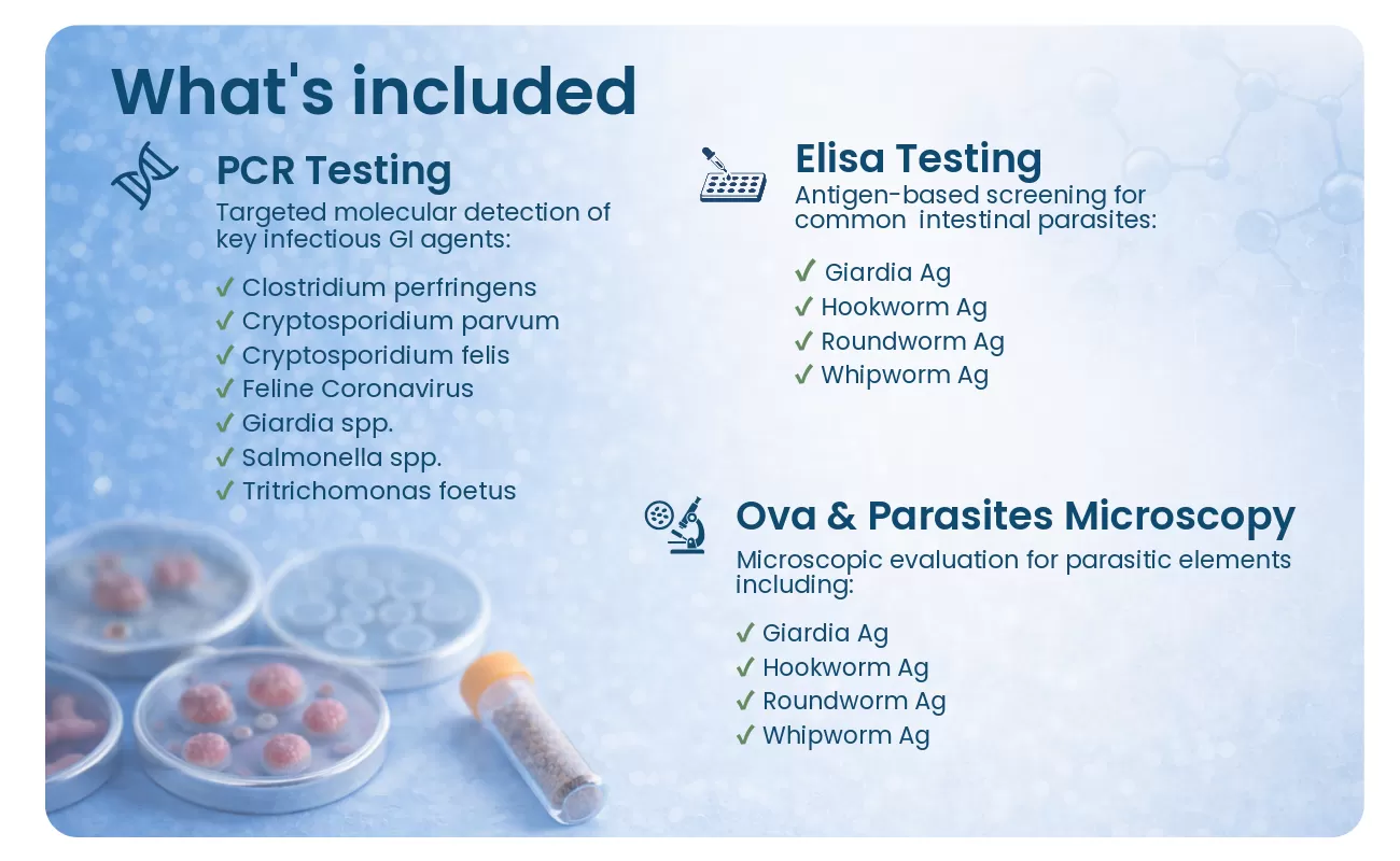 Feline gastrointestinal disease may involve multiple infectious and parasitic causes, and single-method testing may miss clinically relevant findings.